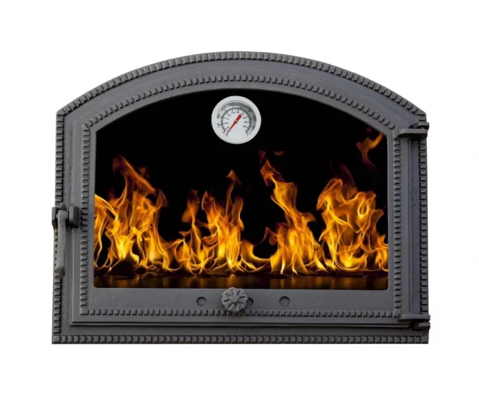 Ușă din fontă Barbeque 570×470 mm cu termometru 500 °C – control perfect și durabilitate maximă pentru cuptor, sobă sau șemineu.